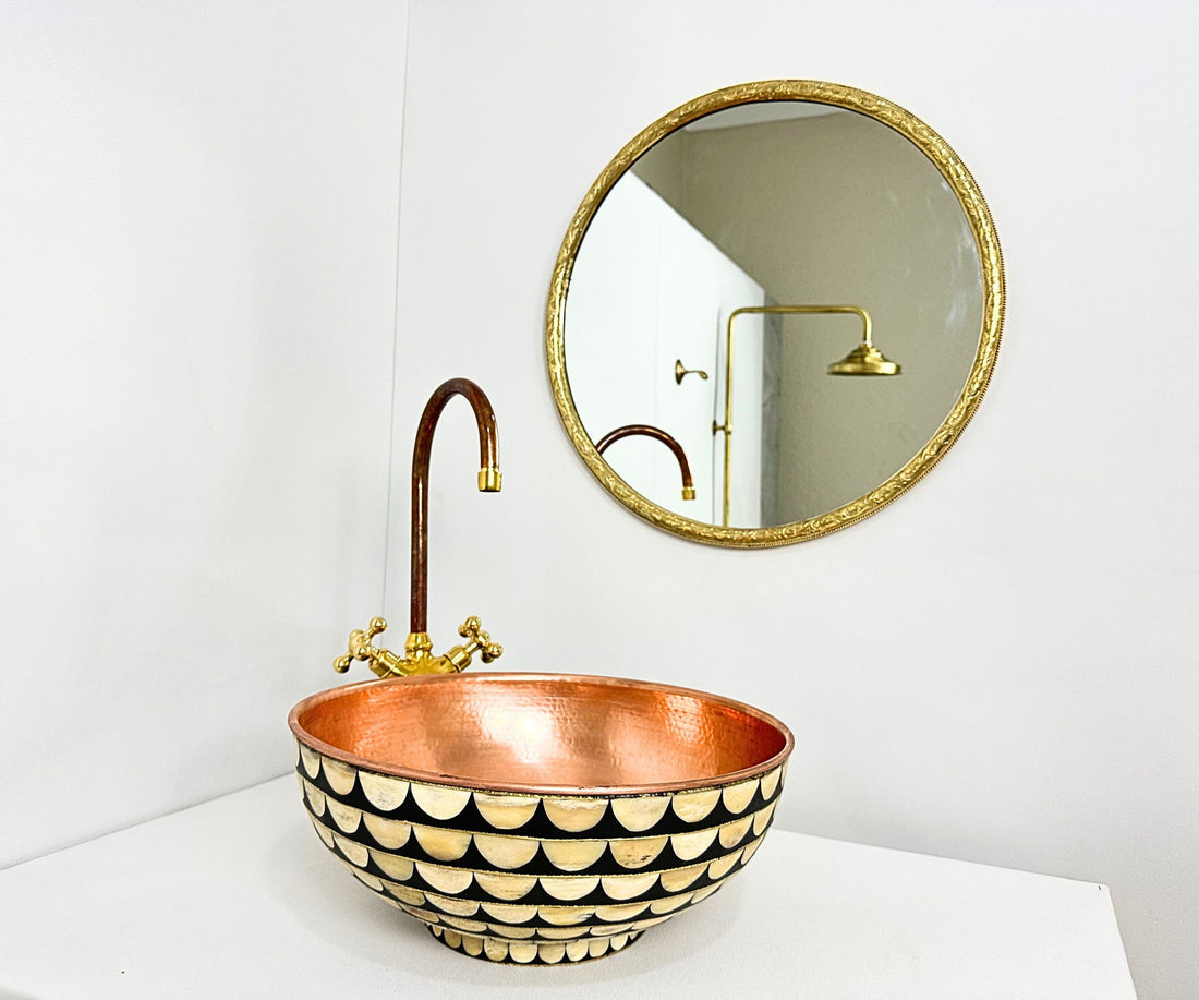 The exterior of the sink is adorned with black resin and bone inlay, creating a striking contrast against the warm copper tones. Meanwhile, the interior remains in its natural copper finish, allowing the beauty of the hammered texture to shine.