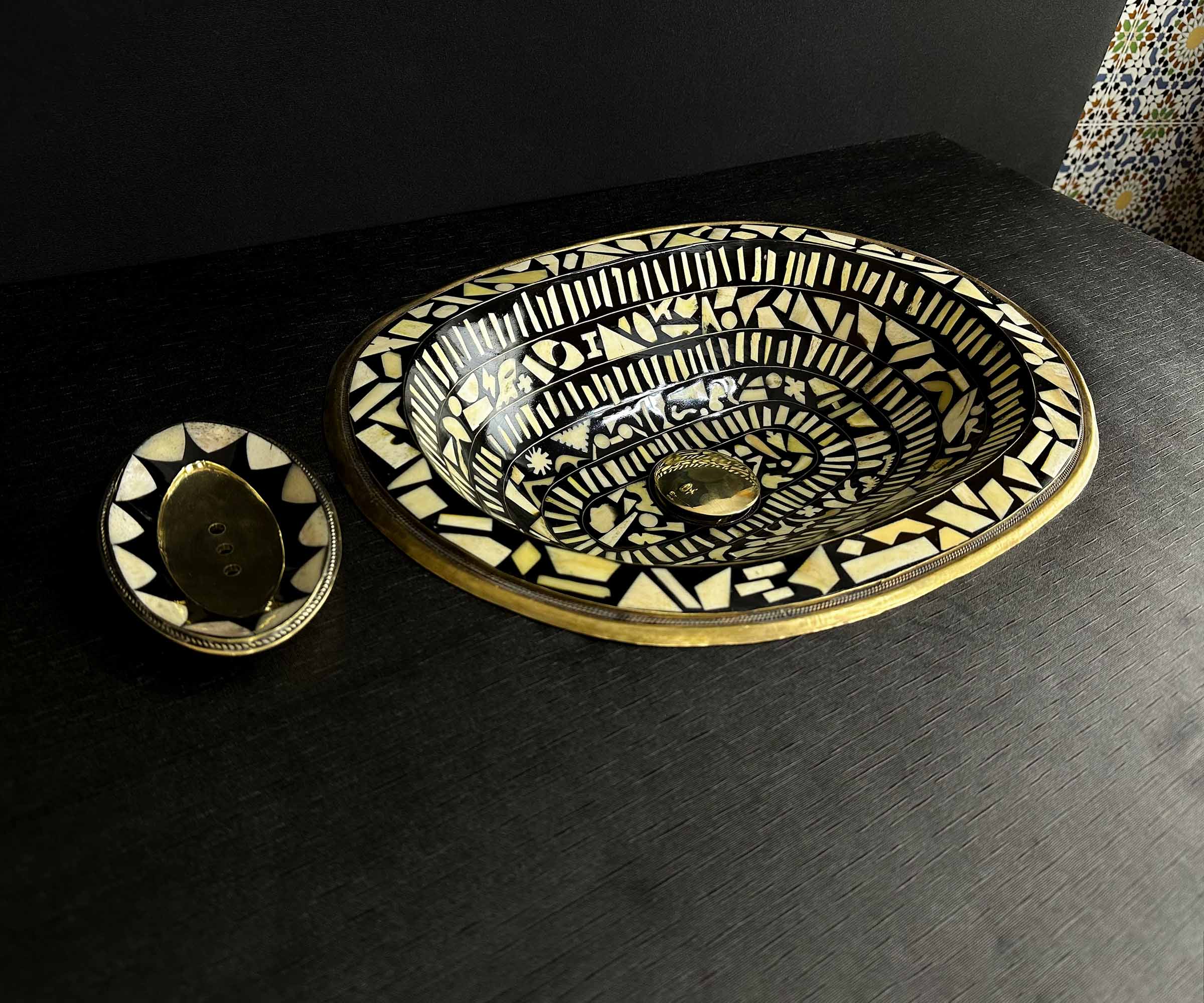 Handmade Brass Bathroom Sink with Bone and Resin - Historical Engravings