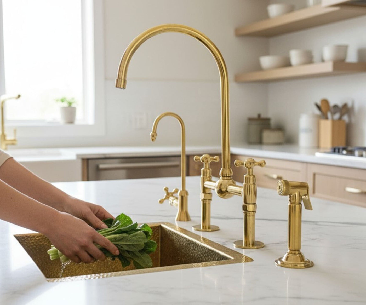 Upgrade your kitchen or bathroom with the LuxeBrass Artisan Unlacquered Brass Bridge Faucet Set—a timeless blend of beauty, utility, and enduring style.