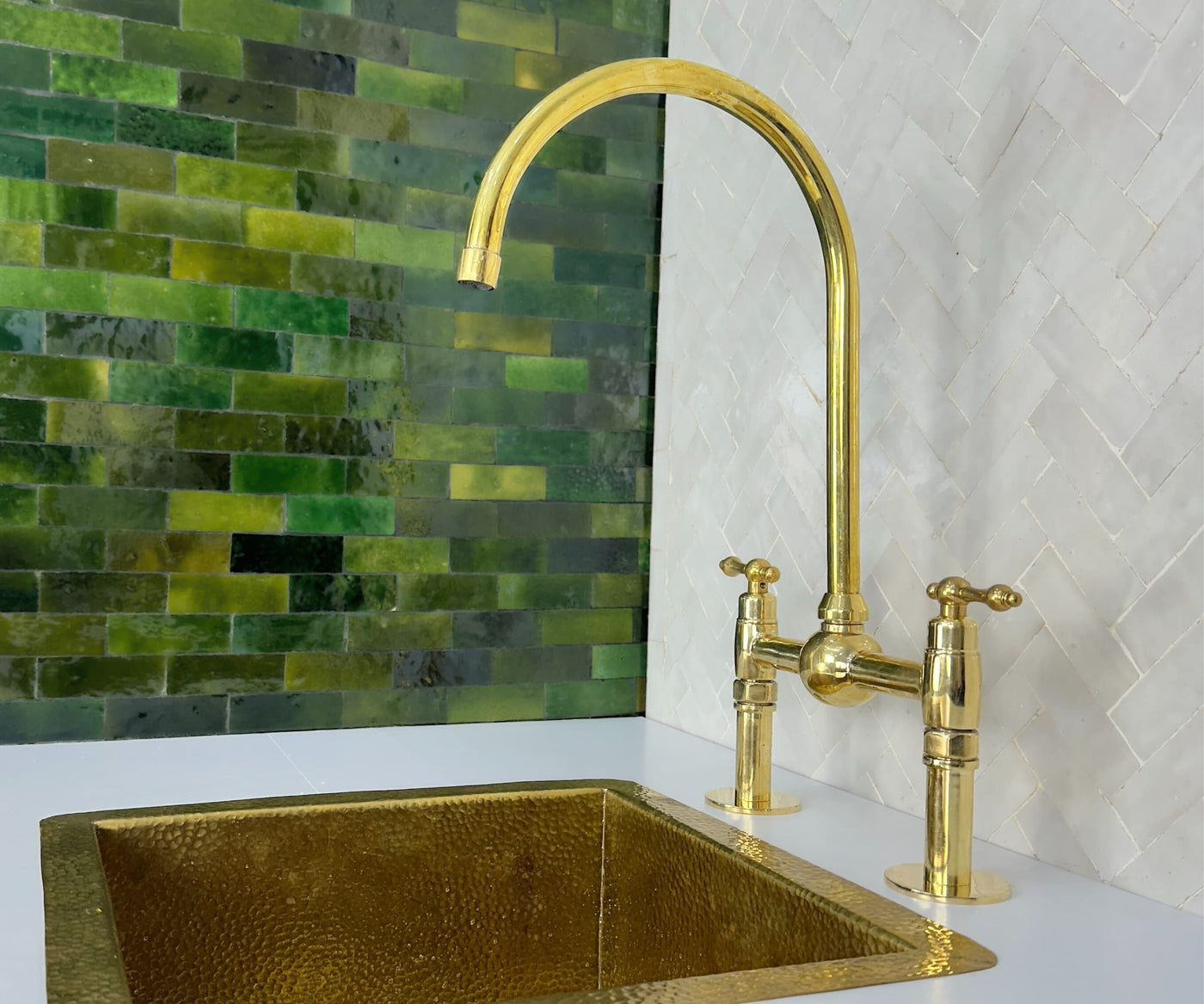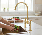 Elevate your kitchen with the timeless beauty of the Unlacquered Brass Kitchen Faucet by LuxeBrass. Handcrafted from 100% solid brass, this bridge faucet is designed for durability, elegance, and everyday use. Its natural unlacquered finish matures gracefully over time, developing a warm patina that adds authentic vintage charm to your home.